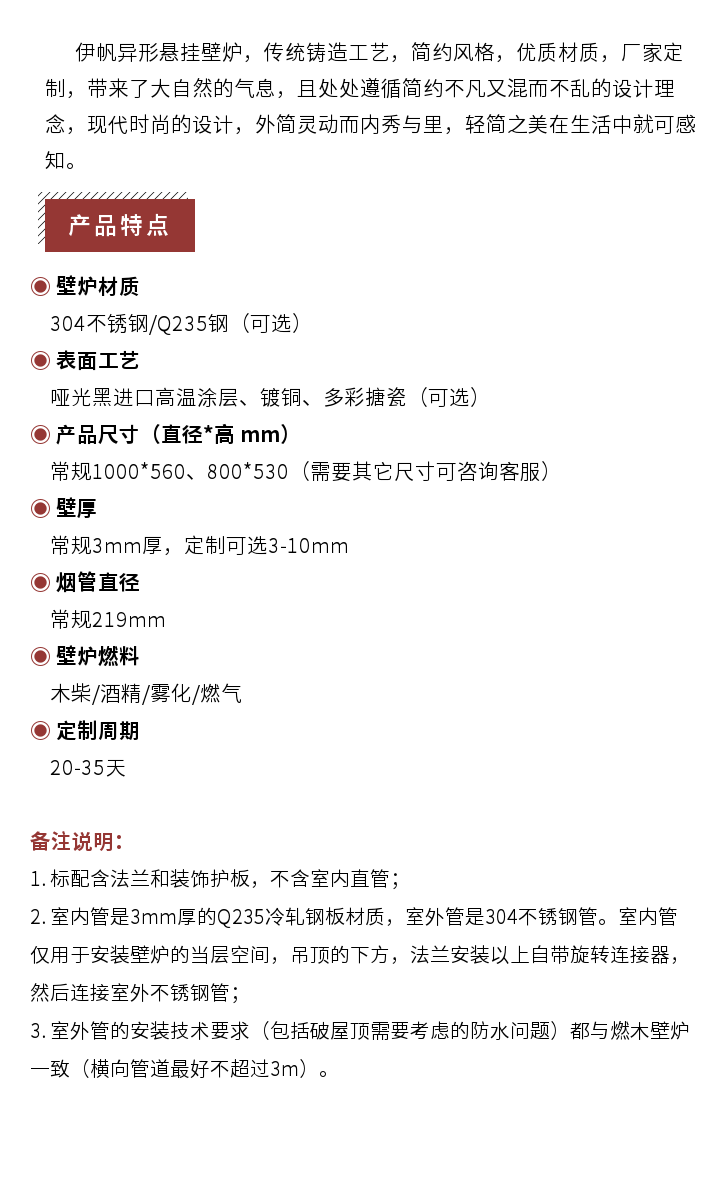 關(guān)于發(fā)貨 | 產(chǎn)品分為成品款、定制款;成品款包括燃木真火壁爐、電壁爐芯、木質(zhì)壁爐套裝、戶外取暖器、壁爐附件、顆粒壁爐。定制款包括:定制電壁爐芯、霧化壁爐、定制燃氣壁爐、大理石壁爐與背景、酒精壁爐、藝術(shù)異型壁爐、原木雕刻壁爐等。成品款供貨周期一般為3~10工作日即可完成備貨與發(fā)貨。定制款根據(jù)不同的產(chǎn)品供貨周期為25~55個工作日以上。純進口真火壁爐國內(nèi)無現(xiàn)貨時供貨期需3-4個月。 |